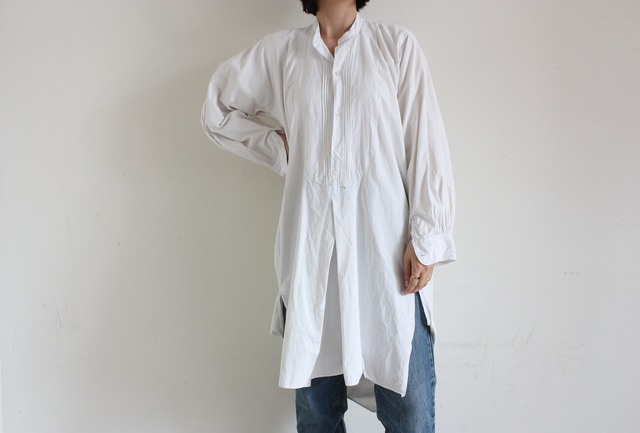 肩幅:39cm 身幅:57cm 袖丈:58cm 着丈:109cm 着用モデル:身長165cm 随所に丁寧な手仕事が見て取れる、アンティークのプルオーバーシャツ。 たっぷりと生地を使った背面のギャザーや、恐らくリネンコットンと思われる平織の生地等、見所もたくさん。 ダメージや汚れなどありますが、それが味となり魅力的な雰囲気をもつ一着。 大量生産品には無い、アンティークならではの愛嬌を感じさせます。 全体的に傷、汚れ、小穴等あります。 着用には支障ありません。 ※店頭でも販売しております。注文が重複してお買い上げ頂けない場合がございます。 ※製造から何十年と長い年月の経った商品です。目に見えないダメージや、シミ、汚れ等コンディションの見逃し等がある場合がございます。 ※ヴィンテージ商品の特性上いかなる理由でも返品交換をお受けできませんので、予めご了承下さい。 何かご質問があれば何なりとご連絡ください。