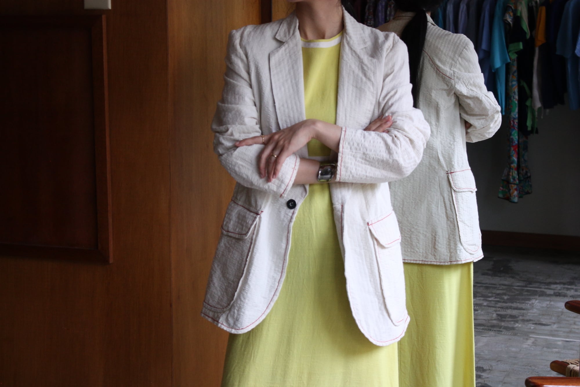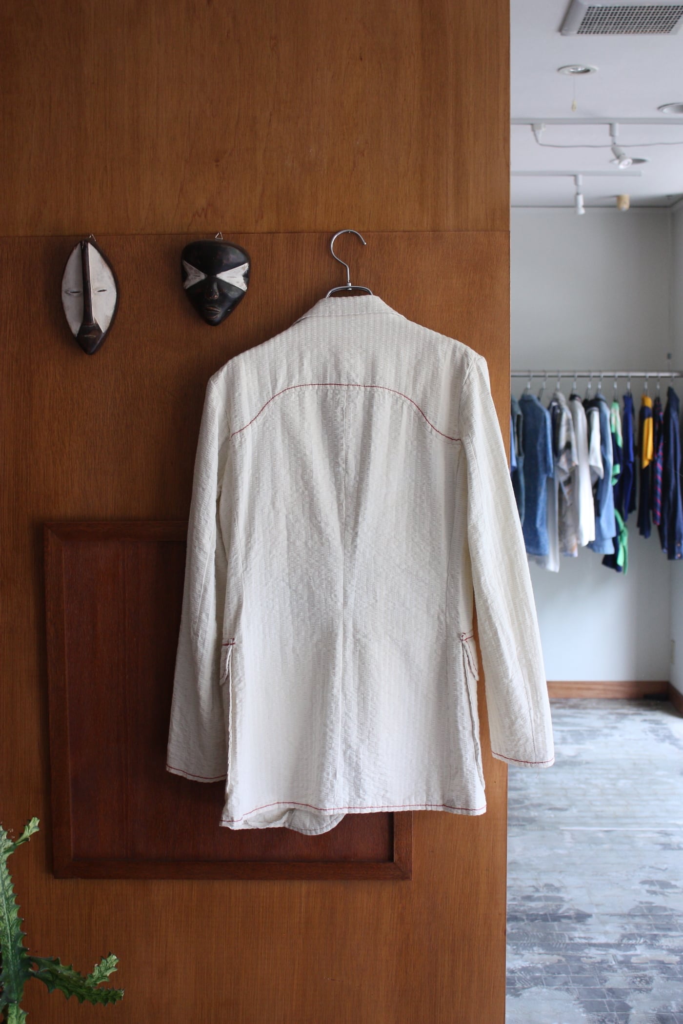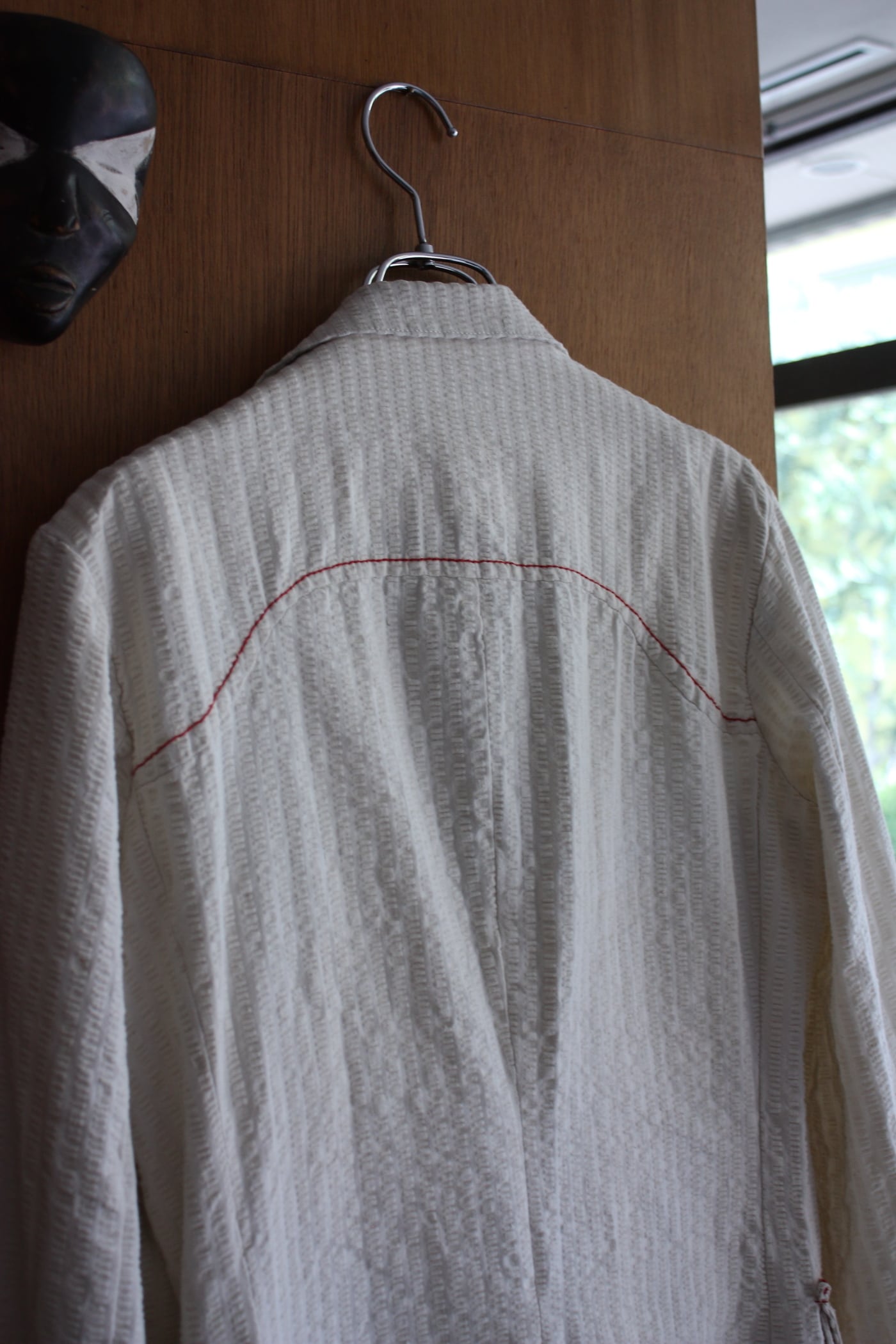 生成り無地のシアサッカーに赤いステッチが映える1着。