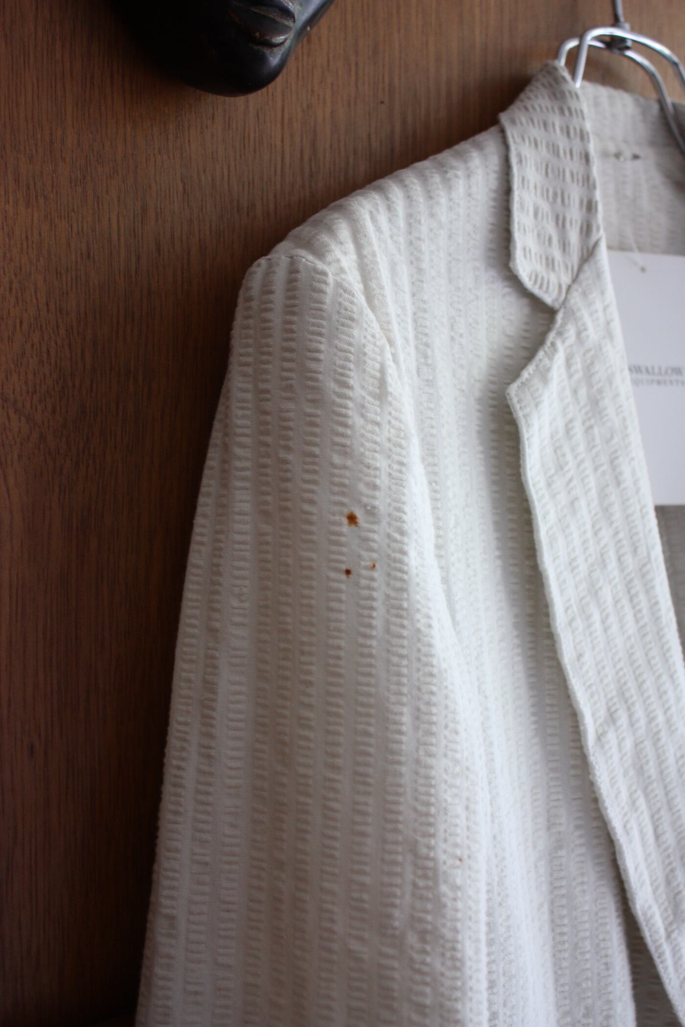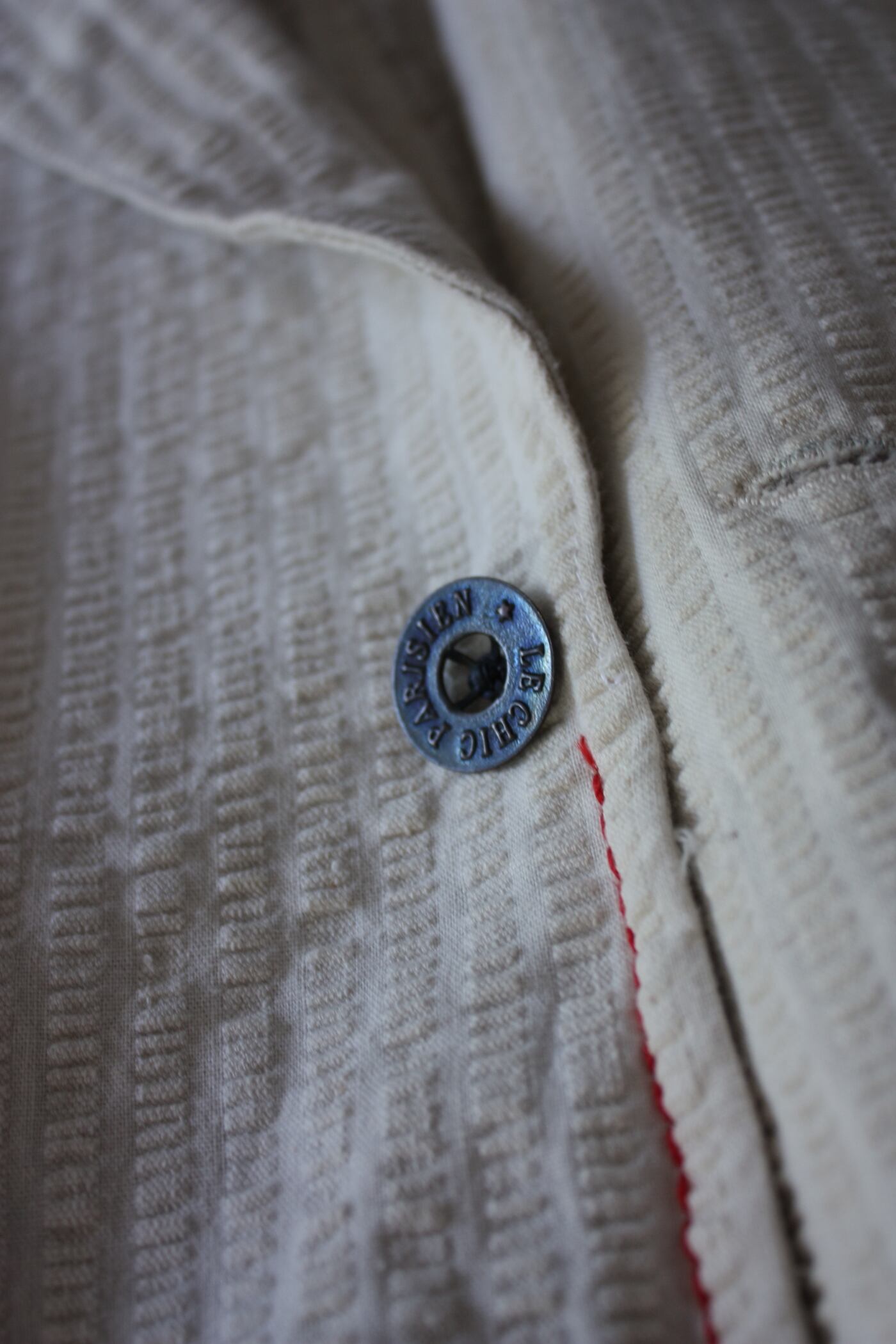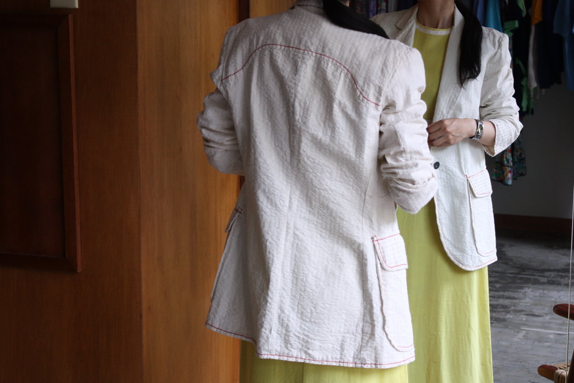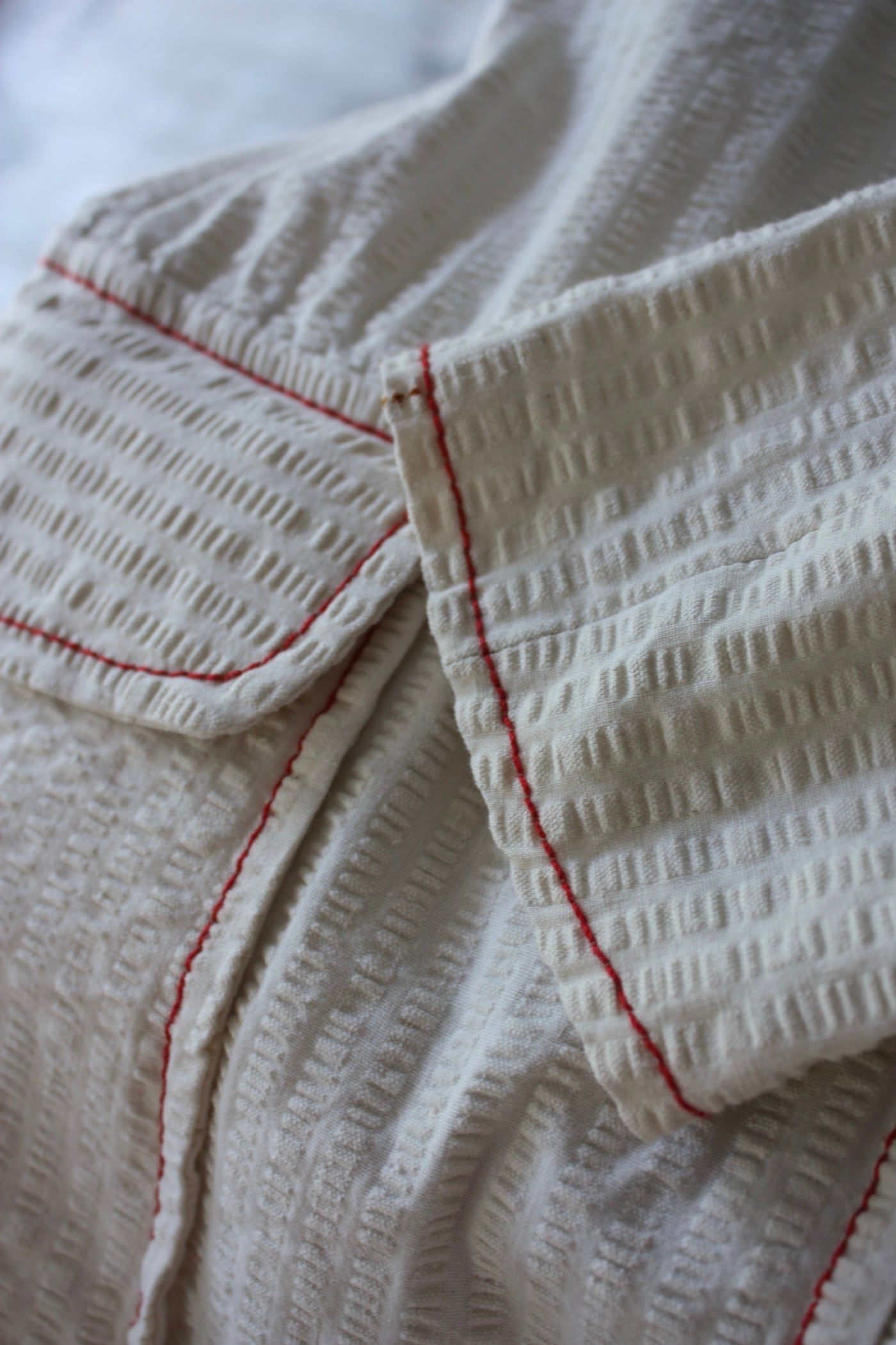 生成り無地のシアサッカーに赤いステッチが映える1着。