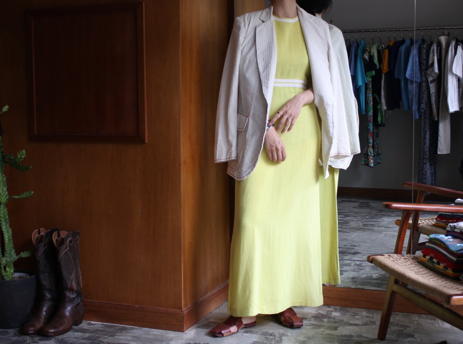 大見返しで裏地は無く、芯地も極力省かれ、軽くシャツ感覚で羽織れる仕様。